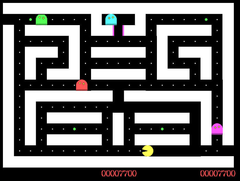 The gameplay consists of eating pills found in the maze while avoiding enemy ghosts. After eating a power pill for a short while, the player will be able to devour ghosts. The game has fourteen levels and randomly occurring bonus items.