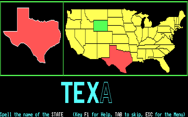 Across the USA is an educational game about the geography of the USA. It teaches locating states on the US map, the official abbreviations of states, and their capitals. All three activities can be selected directly from the main menu. Each activity is based on the same concept: a state is highlighted in red on the US map and the player has to input the abbreviation, name of the state or capital. If the player starts with a wrong letter, the correct one is shown and then the remainder can be guessed. Correct ones are marked in green. When unsure the state can be skipped and will be marked in grey. It will be shown again when all other states have been presented. Additional information can be displayed such as the population and size. The game has options for outlining words, using upper or lower case letters, and a fixed or random order. It keep tracks of statistics such as time elapsed, amount of words done and skipped, number of correct characters, number of key strokes and efficiency.