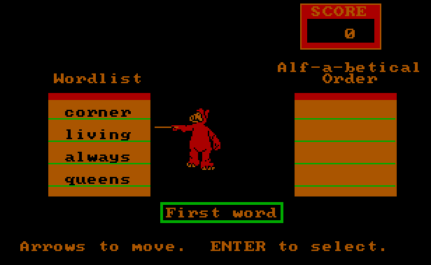Alf’s World of Words is a companion title to Vision Software’s Alf’s Thinking Skills, an excellent edutainment game starring one of America’s most famous children TV characters. Like Alf’s Thinking Skills, AWoW was designed for preschoolers, this time to teach them the English alphabet and basic words. There are several mini-games kids can play, each presented by Alf and his cartoon friends. The games are easy to learn and fun to play, and the level of difficulty is just right for the target audience. If you (or more likely your kids) love Alf’s Thinking Skills, you will also enjoy this game from the same company. It may not have the same quality or number of games as the more popular Super Solver series, but as one of the pioneering edutainment titles, it was excellent by 1988 standard – and remains surprisingly playable even today. Recommended!