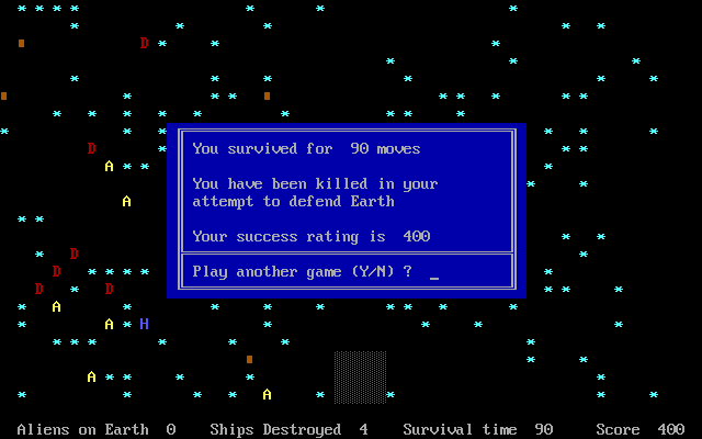 Earth is under alien attack! The player is the sole defender and has to keep the alien ships from reaching their destination by ramming them. Despite the game being technically turn-based, the result is an action game: each round is on a timer and at the end of the time span, all enemies move one field – even if there was no player movement. The round also ends when the player moves with the result that, at least on the lower difficulty levels, a fast enough pace can keep the enemies on their place.