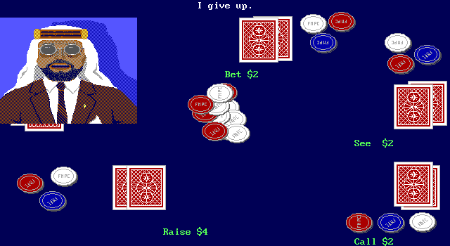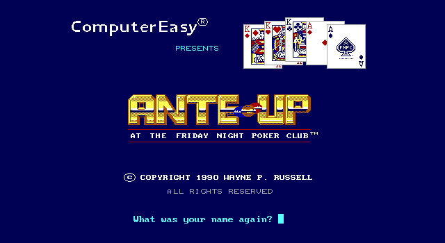 Ante-Up at the Friday Night Poker Club is a your chance to play against four computer players in four different Poker games. You can choose whether you play a variety of games or stick to just the game(s) you want to play. The game modes available are: 5 Card Stud, 5 Card Draw, 7 Card Stud, and Texas Hold ’em. This game also offers a tutorial/lesson mode where the Captain will teach you the basics and different aspects of the game while you play. Again, you can get tutored in a variety of game mode or learn just the game you want. The game presents a top down view and has full card graphics as well as opponent graphics. The usual rules of poker apply to all the poker games, and you use a mouse to pick-up and throw more chips in or to ante-up.