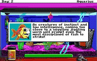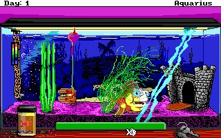Aquarius: An Aquatic Experience is a freeware, open-source arcade game created with custom tools made by fans to develop new games using the venerable SCI engine that was used for many years in several classic Sierra titles. In this simple and short game, the player guides a swimming goldfish with the mouse, carefully moving it around the restrict space of an aquarium to avoid all the environmental dangers and survive a week (with the day cycle occurring every half a minute or so).