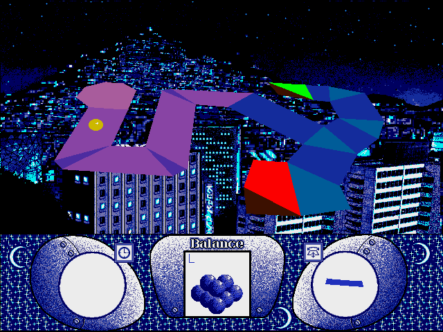 This German game of dexterity delivers what the title promises. Balance is a lesson in applied gravity: guide a ball to one or more targets by tilting the plane it sits on, much like in those little plastic toys that drive you insane. A simple premise made challenging by tricky, maze-like level layouts that go beyond the “A to B” routine, but require you to touch a certain number of target tiles in no particular order. You must reach all targets in limited time, or else you have to start over. If the ball falls off the edge, one of ten lives is lost. Special fields such as jumpers, accelerators or crumbling tiles test your reflexes; some levels even rotate.