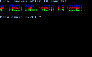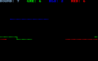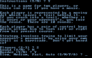 Taking a tip from 1977’s Surround for the 2600 (and later, the 1982 movie Tron and its light-bike spin-offs — but don’t ask me where the banana came in!) this is one of those games where you control an extending line on the screen, avoiding collision with your own trail or that of the other player(s).