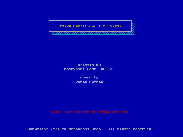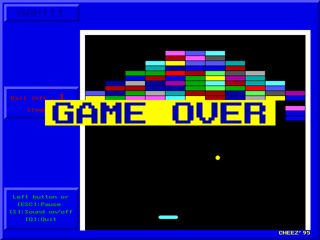 Bap is a freeware Breakout-style game. The player moves a paddle across the bottom of the screen. This deflects a moving ball which strikes, and destroys, blocks in the upper part of the screen. There are thirty levels in all and there is no scoring system. The objective is to complete all the levels. At every third level a password is provided so that the player can resume playing a that level. The paddle can be controlled either by a keyboard or by a mouse. Sound is optional and where present consists of a squeak when the ball makes contact with the paddle or a brick and a very short tune at the start and end of the game.