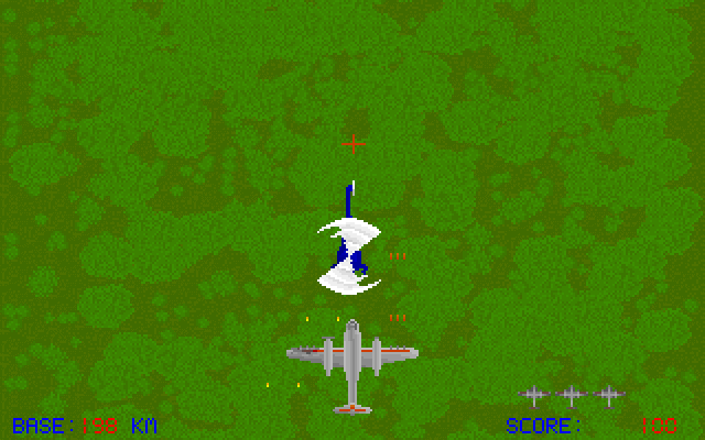Bomber is a vertically scrolling shoot ’em up where the player flies a B-29 bomber and must destroy three heavily guarded enemy bases. On each level the player must make it through enemy lines to the base which is always 200 kilometers away, the remaining distance indicated in the corner of the screen. The plane can move left and right, as well as accelerate and decelerate. The bomber is equipped with two types of weapons: a cannon to destroy aircraft, and bombs to destroy ground targets such as bunkers and tanks. A red crosshair indicates the location at which the dropped bomb will explode. The player has three lives, and a bonus life is awarded for every 10,000 points.