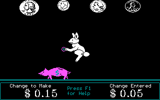 In this children’s game, a rabbit named Eddie is collecting change in his piggy bank. Each round, an amount of money is displayed on the screen. By moving Eddie under the correct types of coins and jumping up to catch them, the player has to count out exactly the right amount of change. Despite the elements of moving and jumping, no dexterity or timing is required to play; the player can’t possibly miss a coin, and the challenge is entirely mathematical.