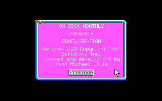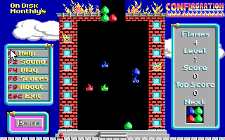 The object of Conflagration is to extinguish all the flames in the building. Any group of water droplets of the same color will extinguish flames of that color provided there are five or more in a contiguous group. This group of droplets can be in any shape as long as its members are “chained” by contact to the left, right, above or below. When all the flames have gone up in a puff of steam, the building is saved, and you move to another burning building with more flames and more challenges.