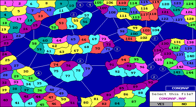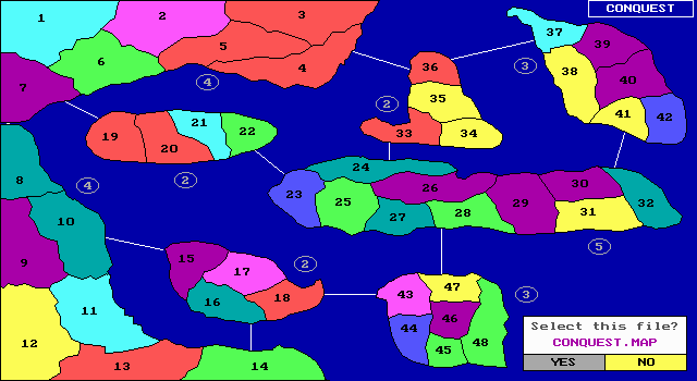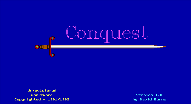 Conquest is a Risk clone which uses the same game rules as the original game. The player places his/her army on the given map and must conquer the majority of the lands to win. Attacks can be made to adjacent lands and are made in turns. Once a battle is won the winning player can move their armies into the territory they just won. Eight people can play via modem or shared keyboard or other players can be assigned to the computer’s AI.