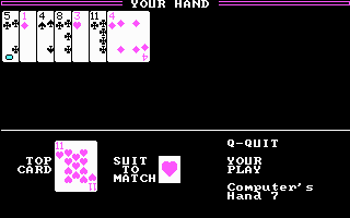 This adaptation of the classic card game was included in Big Blue Disk #21. In it, the player faces a computer opponent, using the keyboard to pick which card to play next. As in the card game, the player’s object is to get rid of all of his or her cards as quickly as possible. The player must match either the value or suit of the previous card played, and eight cards are wild. If a card cannot be legally played, the player must draw, thus moving farther away from victory.