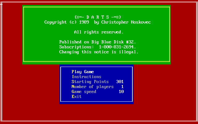 This simulation allows players to throw darts at a virtual board by hitting the space bar three times at critical moments. The first hit determines where the dart is aimed on a horizontal plane, the second determines the angle of the throw and the third determines the strength of the throw. The object of the game is to run out of points; points are lost by successfully hitting the dart board. Players cannot score until they have “doubled in” by hitting a double scoring area, and they must “double out” by hitting a double scoring area worth exactly the right amount of points in order to reduce their score to zero. The starting point value and the speed of the program can be adjusted.