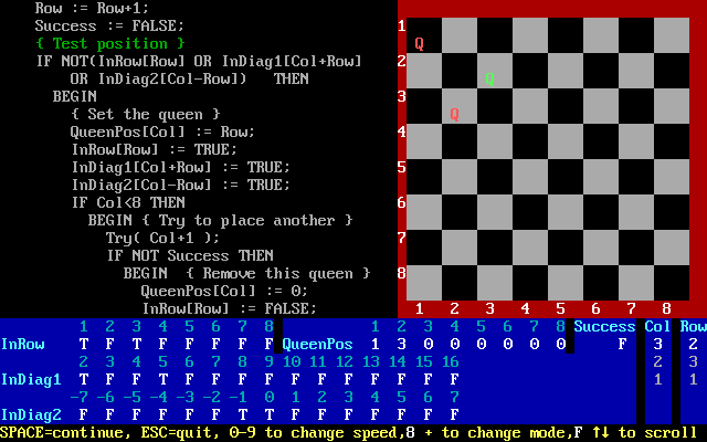 See your PC solve the classic problem of placing eight queens on a chessboard with no two attacking each other. Includes algorithm in Turbo Pascal code.