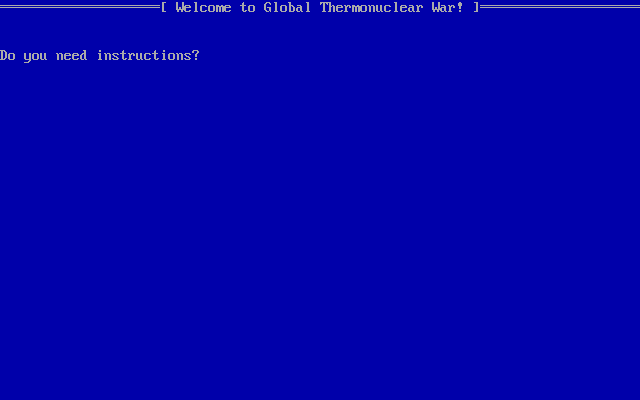 The purpose of this game is to kill a maximum number of people. You may choose to play either for the US or the USSR and the computer will play for the other side. You are supposed to launch Inter-Continental Ballistic Missiles (ICBMs) at your opponent, who will respond in kind. You can intercept the incoming missiles by launching Anti-Ballistic Missiles (ABMs). Sometimes ICBMs malfunction and detonate in the atmosphere or veer off course into other counties. Your score is the total number of people killed by the missiles, irrespective of nationality. If you play the US, you can choose to have the Strategic Defense Initiative (SDI) present. It will destroy or deflect incoming Russian missiles and lower your score.