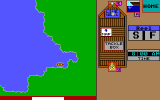 Gone Fishing is a fishing simulator. Starting small in a rented boat with a plastic worm, a spinner, or other tackle, you can work your way to tournament status, purchasing not only additional tackle, but also equipment such as depth finders and serious bass boats. The player takes over a character’s life, balancing business and fishing. Game elements include examining the weather forecast and deciding where to fist. Regular work needs to be done to provide money for the fishing hobby, or tournaments can be entered for financial support when they are won. Once a fish has been caught, it needs to be managed carefully to reel it in.