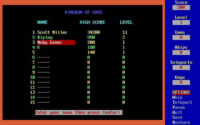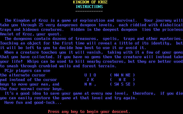 A text-mode action/puzzle game. You have to get to the exit on each level, which is made more difficult by obstacles such as trees (which can be destroyed) and monsters. Various puzzles (in the form of one-off objects) are also used.