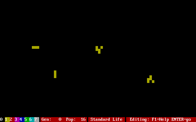 This game, offered in Big Blue Disk #28, is a simple implementation of John Conway’s Game of Life, a mathematical diversion which simulates artificial life by applying a simple algorithm to an array of cells. This particular version allows the user to manually or randomly create a pattern and then watch it evolve in real time or step-by-step using either the classic algorithm or what it calls the 3-4 variant.
