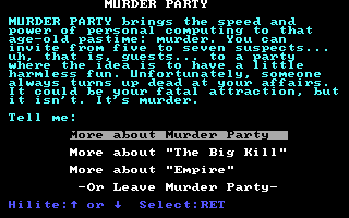 Make Your Own Murder Party is a 1986 whodunit role-playing video game. The host of the murder mystery party inputs and series of data about their party guests, and the game automatically generates a mystery with a murder, motives, and a series of clues for up to 8 players. These are all able to be printed as player booklets. The game is also able to print invites for the guests, and offers advice on how to host the perfect murder mystery. Once the booklets have been printed out, the game becomes purely physical like a normal murder mystery party; the game simply allows a streamlined process to generate a mystery.