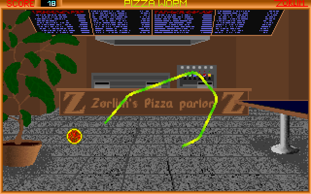 You play a green worm and you have to go around and eat the pizzas. But every time you eat a pizza your tail gets longer. Instead of other nibbles type games Pizza Worm can move in a lot of different angles rather than just right angle turns (like Rattler Race).