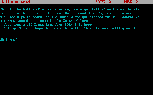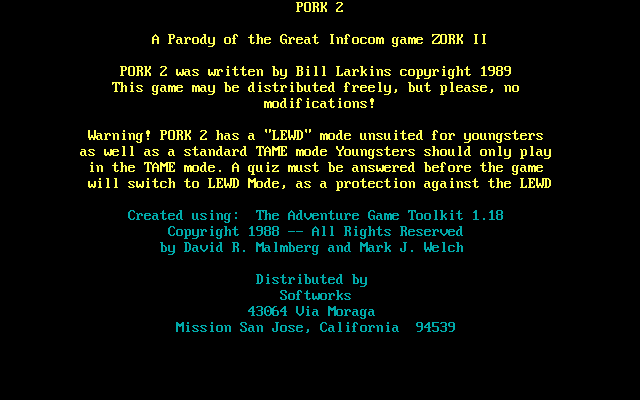 A parody of Zork 2: The Wizard of Frobozz, with an urban setting and a tapdancing chicken organ as the villain. Smaller, easier, sillier, and less biting than Pork 1. Entirely based on scenes from Zork 2 – thus, only of interest to people familiar with that game, and even to them, only as a mild amusement. Contains a LGOP-style “Lewd mode” which only affects one scene.