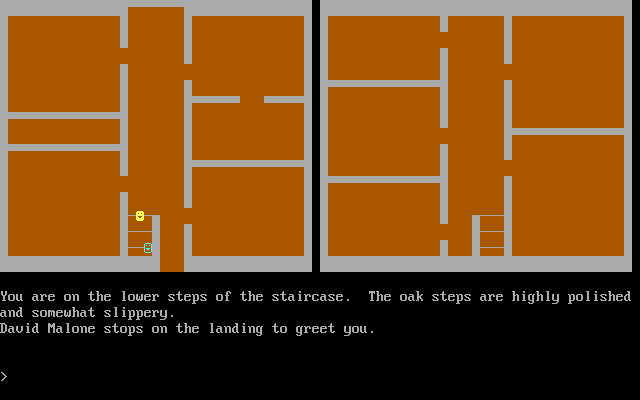 Sleuth is an interactive murder mystery. As a game of Sleuth begins, a murder has just been committed. It is your job to explore the house (which is displayed on the screen), to question the house guests for their alibis, and to locate both the murder weapon and the scene of the murder. The challenge of Sleuth is to solve the crime, gather all of the suspects together, and accuse the guilty party before the killer becomes suspicious of your investigation and eliminates you from the game. Each game of Sleuth is different from the last, so you must always explore the house fully before you can solve the murder. Also, to make things more interesting, you can choose a `Personalized’ option which allows you to populate the house with your friends and acquaintances.