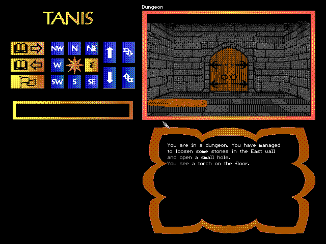 TANIS is a first person text-graphics adventure game. The scenario is that of an old AGT text adventure game named “Deena” and created by E. L. (Ev) Cheney (1987-1988). Due to the full graphic interface, there is no need for the player to type her/his commands. She/He may choose verbs (23 in total) and nouns from scrolling lists. Furthermore, there are also 17 actions available, which are accessed by LEFT clicking of the mouse on certain screen buttons.