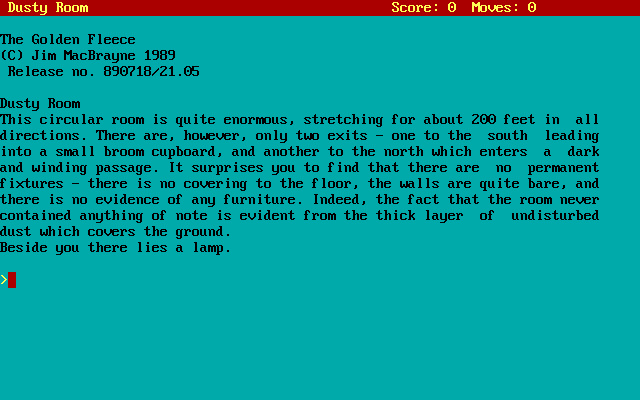 Jim has obviously been strongly influenced by Infocom when writing The Golden Fleece, relying on a good storyline and atmospheric descriptions, not to mention intricate puzzles! I would have preferred a few more easy puzzles dotted about the game to make me feel I was achieving more in the early stages, rather than spending a lot of time exploring and mapping but otherwise making little progress.