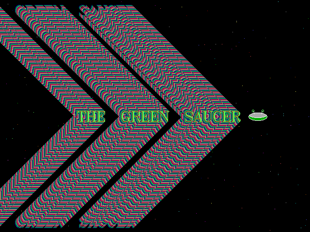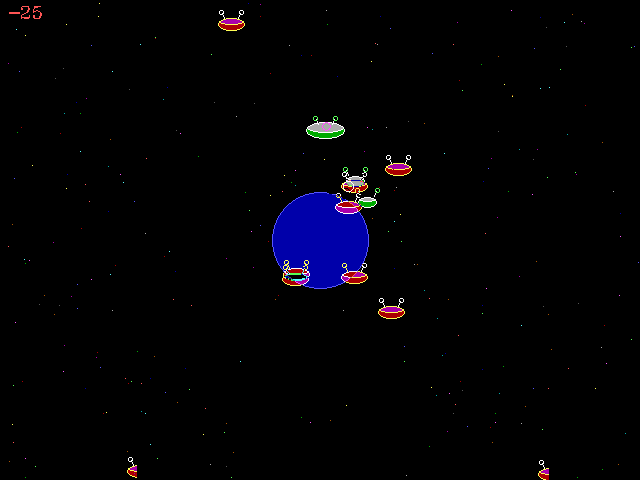 This is a freeware turbo pascal game in which you defend the earth from small red saucers by using a big and little green saucer (controlled by the keyboard and mouse respectively).