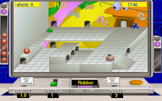 In Wild Science Arcade, kids learn about physics by maneuvering a ball using four variable settings: gravity, friction, ball material and initial force. Although it resembles visually the classic Marble Madness, the gameplay is easier, aimed at the younger gamer.