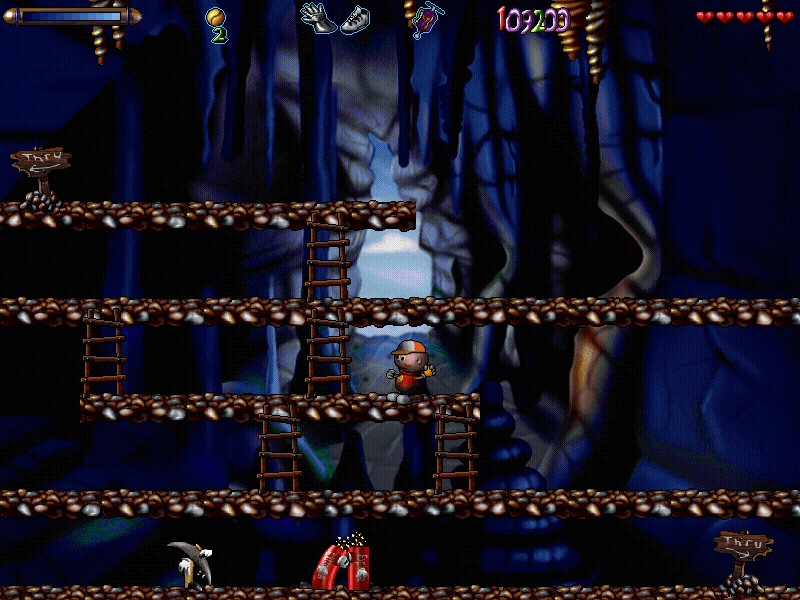 In The Worlds of Billy a boy named Billy has to cross 100 arcade levels to get back home. But of course there are bad guys who wants him dead and in this case the culprits are fruits. To get rid of them Billy has to dig holes in the ground and whack them with his hammer when they fall in – similar to Lode Runner.