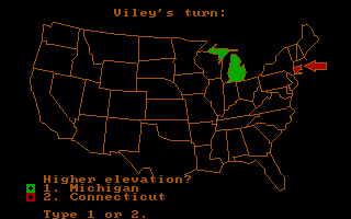 Up to four players may take part in this educational game, which tests one’s factual knowledge of the fifty states comprising the USA. Two basic forms of quiz are included – one is State Comparison, where two random states are selected in each turn, and the player is asked to compare different aspects of the two (area, population, population density, largest metropolitan area, highest elevation). The other is States Facts, which highlights one state at a time and poses factual questions about it (its name, two-letter code, capital, largest city, and the year it was admitted into the Union).