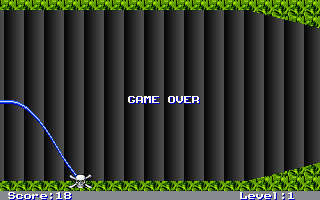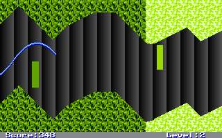 Urthwurms move differently from earthworms; rather than burrowing through dirt, they seek existing tunnels and are stopped dead in their tracks if they run into an obstacle head-on. But as invertebrates, their simple central nervous system makes them difficult to control, and the player’s urthwurm’s movements are directed with a single button that adjusts their trajectory through 10 levels of endlessly side-scrolling horizontal tunnel, carelessly littered with blocks strewn across its course. When the button is depressed, the wurm gets a buzz and adjusts its course to counter its downward motion and start heading up; when the button is released, gravity resumes its normal pull — maintaining a constant course is hence very tricky and the player is much more likely to leave a trail looking something like a sine wave.