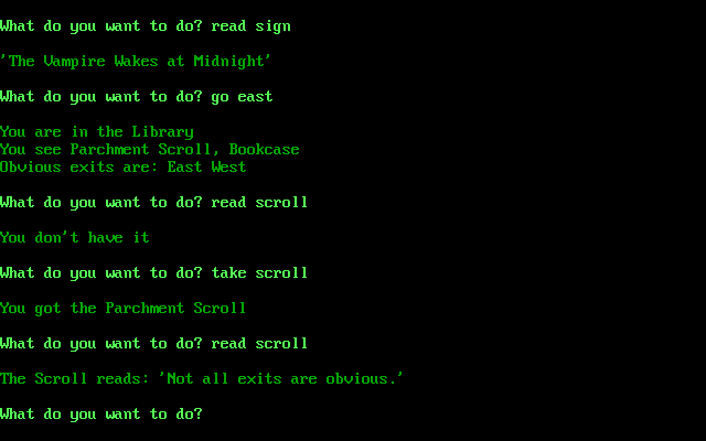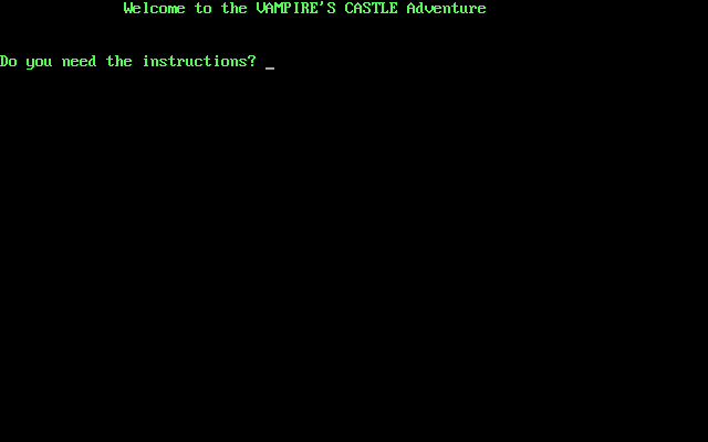 This short text adventure (written in a mere 181 lines of BASIC code) has the player exploring a vampire’s lair in search of the game’s “concealed goal.” Not surprisingly, room descriptions are extremely terse and there aren’t a whole lot of actions to perform. The parser accepts two-word commands (though it only looks at the first three letters of any given word) and has a vocabulary of about seventy words.