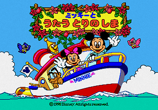 Mickey to Utau Tori no Shima: Minnie o Sagashite Waku Waku Daibouken! (ミッキーとうたうとりのしま ミニーをさがしてわくわくだいぼうけん!) is a Japanese-only Sega Pico game starring Mickey Mouse and various other classic Disney characters.