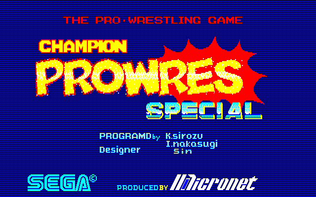 Champion ProWres Special is an arcade wrestling game for one or two player simultaneously. There is a choice of eight wrestlers, each with a different look and a different set of moves. They resemble contemporary American and Japanese wrestlers but are unlicensed (e.g. H. Hogen, A. Giant). Characters can be moved in eight directions and three buttons are used to execute the moves. The game takes place in a large ring with a referee, but it is also possible throw out a wrestler at the bottom and continue fighting below. The referee will start a countdown then and the wrestlers have twenty seconds to get back in the ring. A single round takes three minutes. The wrestlers can brawl with a large amount of moves, from kicks and punches to holds, pins, throws, piledrivers, hurtling an opponent into the ropes to make them run into an elbow and so on. Wrestler health is shown through coloured pain waves the wrestlers radiate when they are down. Yellow waves usually refer to a short stun, while red ones are dangerous as they can lead to a game-ending pin as the referee counts down. There is a score system and three circles near the top of the screen are used to keep track of the standings over different rounds.