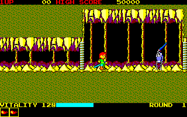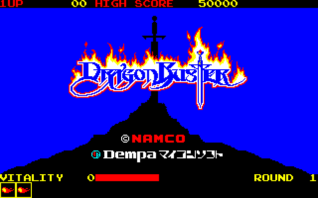 Originating in the arcades, Dragon Buster is an action platform game composed out of several large levels, each one containing various stages: a cave, a tower, a castle, etc. The player’s goal in every level is to reach the final stage where the protagonist faces the level boss. There are often several ways to reach the final stages, and not all stages are necessary to visit. Equipped with a sword, the player character moves through platform stages, clearing them of diverse monsters, collecting power-ups and trying to stay in good health until the level boss, since it is impossible to heal between the stages. The hero’s life meter (called “vitality” in the game) is the first introduction of such a feature to action games.