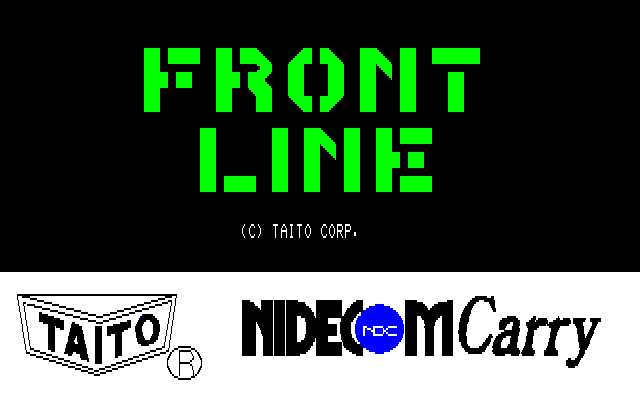 Front Line is a vertically scrolling action game. Your mission is to infiltrate enemy territory and destroy their fortress. To reach the fortress, you will have to make your way through varied and dangerous terrain. Jungles, deserts, brush, and rocks all slow your progress, plus each area has numerous enemy fighters and tanks trying to stop you. To help get past these obstacles, you are armed with a machine gun and grenades; at some points in the game you may even come across an abandoned tank which you can control to increase your odds of survival. When you reach the end of the level and successfully destroy the fortress, the game will repeat at a higher level of difficulty. Gameplay is for one or two players, and four different skill levels are available.