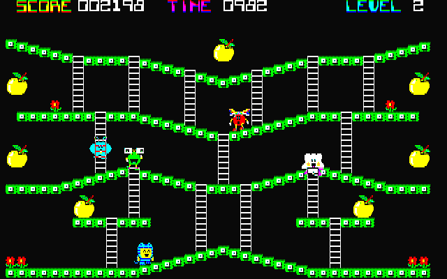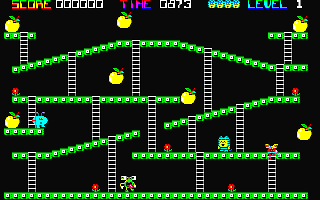 The player’s goal in Harvest is to collect all apples on single screen level layout with his cat-resembling character, while being chased by multiple enemies. The gameplay can be compared to Lode Runner to some extent. While the player can’t dig holes to trap enemies, they can be jumped over. A fall from heights will result in the loss of a life, as does the running out of a time limit. Once all apples have been collected, the player advances to the next level with a different layout and enemies.