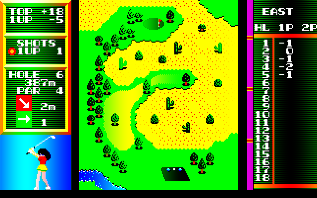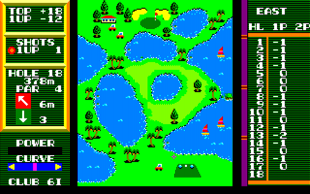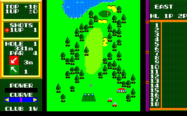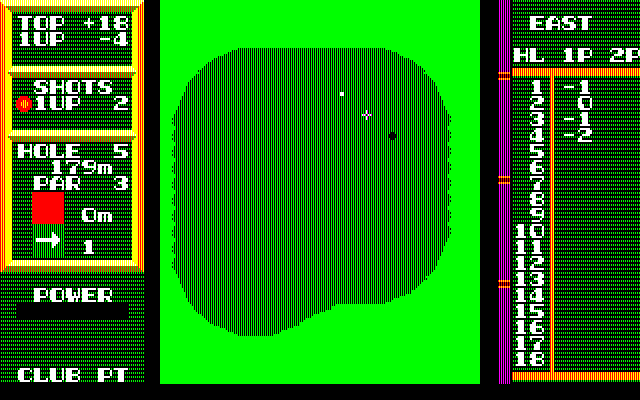 HAL’s Hole in One is a standard 18-hole golf game, played from a top-down perspective. You can compete in stroke play with up to four players, or match play against a friend or the computer. When playing against the computer, you will play against an opponent that uses metal clubs, which hit farther than the standard wooden clubs.