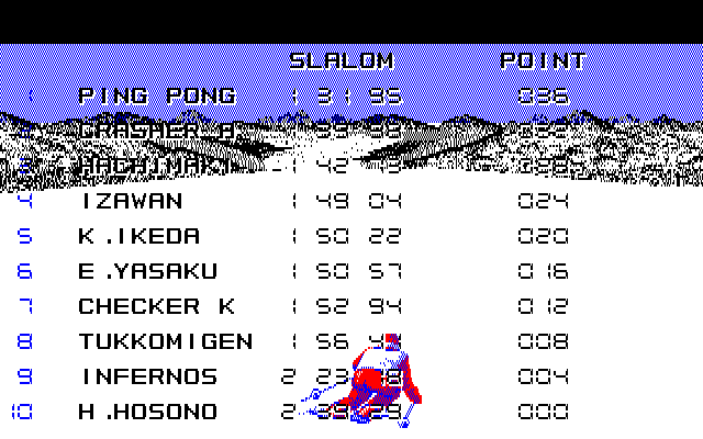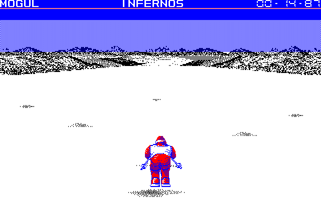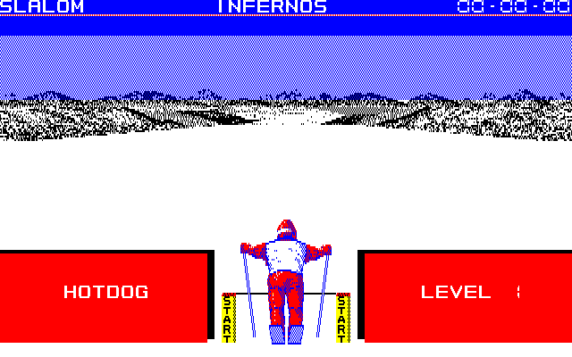 Hotdog is a simple skiing simulation game offering three events: slalom, mogul, and aerial. The player controls the skiier, and can move left and right as well as increase or decrease the speed. There is a single-player mode where the player is ranked against computer opponents, as well as a multiplayer mode for up to five players.