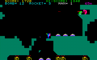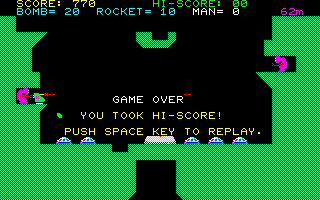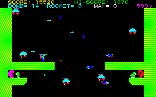 Kagirinaki Tatakai is a vertically structured platform shooter. The player controls a character whose goal is to descend as deep as possible into a complex underground system. The protagonist is equipped with a jetpack (which allows him to hover in the air for a while), a laser gun with unlimited ammunition, as well as limited supplies of rockets and grenades. Rockets can be shot straight ahead, while grenades can be thrown down in curved trajectories. Various types of enemies, both stationary and moving, will try to stop the hero by shooting at him. The player character takes no damage from either physical contact with an enemy or falling.