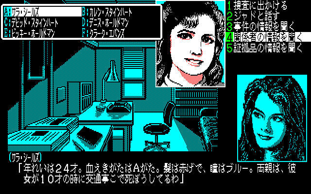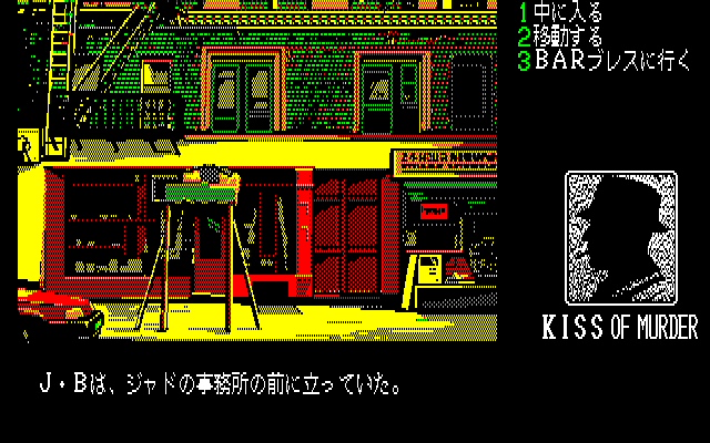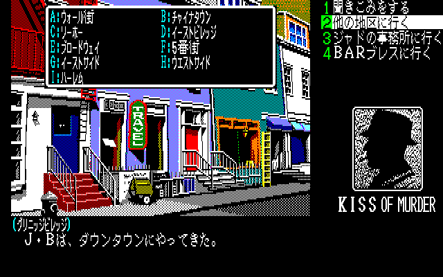 Kiss of Murder is an adventure game set in a parallel world to Manhattan Requiem. While it features the same graphics and set of characters as that title, it has a completely different story. In Manhattan a large blue sapphire has been stolen and a young woman named Sarah Shields who worked at a jewelry store has been murdered. Insurance investigator Judd Gregory has contacted the private detective J.B. Harold and asked him for help with the case. Gameplay involves going to various locations in New York, talking to people, interrogating suspects, finding clues and gathering evidence.