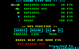 This is a port of the PC-8001 game by Takanari Suzuki (pen name: Geimu Kyouji) originally published in I/O Magazine’s April 1981 issue.
