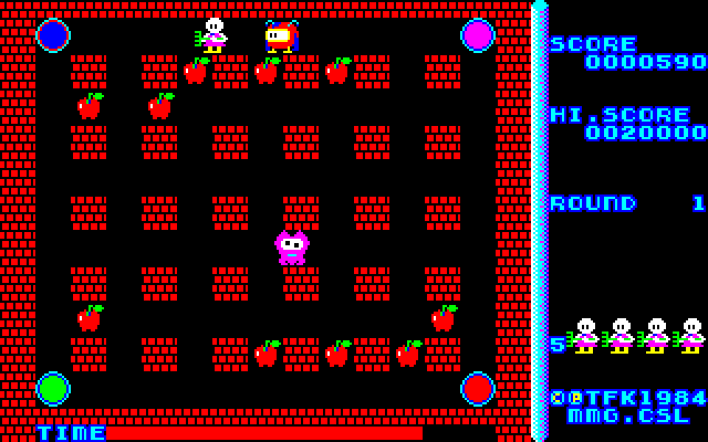 Mr. Pac! is an action game in which you take control of the main character, Mr. Pac! holding a fork-shaped farm tool. The object of the game is to collect all the items on the screen without getting hit by Pocky or Nanjamonja. The task must be done within a certain time limit. If all the items have been taken, then Mr. Pac! will go on to the next round.