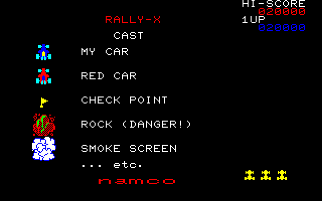Rally-X (ラリーX), is a racing game that in racing playfields, you control a blue car, that it’s job is to pick up all the flags before the red cars crash into the blue car. The game came out in 1980, the same year as Pac-Man and King & Balloon. To stun the red cars, you have a smoke screen always enabled until if you run out of fuel, slowing your car down, making red cars easier to win. If you get the top high score, even though it does not give you a name to enter in, but congrats you. The objective is to collect all the flags, like stated above. Unfortunately, the 1980 was not popular, but in 1981, New Rally-X came out, with more music and sound effects, different cars and fields, and a new Lucky Flag, which if collected, will redeem your fuel for points, and if so, it will not drain your whole entire fuel.