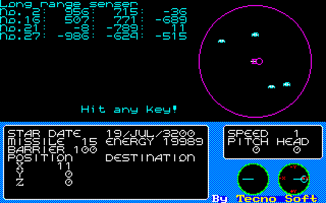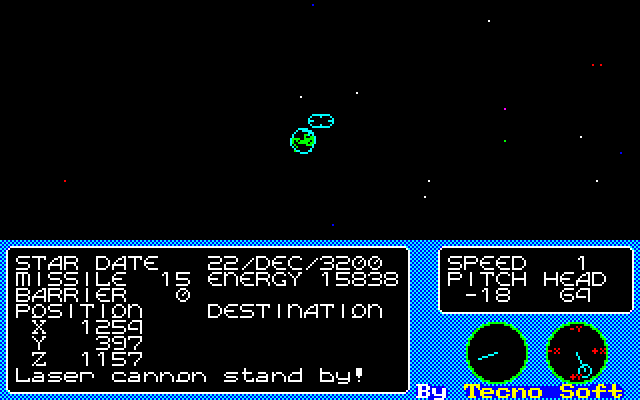 One of Tecno Soft’s earliest computer games, Star Fleet came out the same year as SEGA’s Star Trek arcade game. Judging by the minimap appearance of your interstellar vessel, Star Trek was an influence on the developers behind this title. It was released for the Fujitsu FM-7/8, Sharp X1/MZ-500, and NEC PC-6001/88/98 computers on cassette tape. This was the first space-based game developed by Katsunori/Kotori Yoshimura, a prominent programmer and game designer from the golden era of Japanese PC gaming; his later works include games like Reviver and Star Cruiser, the latter of which revived Star Fleet’s game systems in the form of a CRPG.