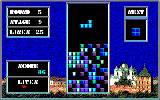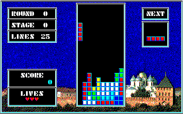 This version of Tetris is one of many conversions of the famous block-stacking game. The goal is to place pieces made up of four tiles in a ten-by-twenty well, organizing them into complete rows, which then disappear. The goal of each round is to clear 25 lines, after which the player moves on to the next round. If the stack reaches the top of the field, the player loses a life, and if all three lives are lost, the game is over.