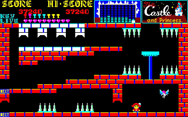 In the puzzle and platform game The Castle the player controls a prince that has to save the princess. To find his princess he must explore the castle, which has a hundred different rooms. Each room is a puzzle on its own as the prince must avoid enemy knights, fat Tiroler men, hazardous objects and has to use objects to get to the next door. In each room the prince has to collect keys and items, such as rings, gold bars and bottles. The bottles will give the prince an additional life. The keys may have different colors and only opens doors with the corresponding key color.
