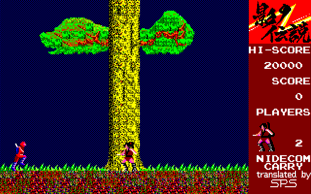 You play Kage, a skillful ninja in search of rescuing Princess Kiri from the hands of the warlord Yoshi. Armed only with a sword and ‘star knives’, you must fight your way through countless henchmen and the occasional boss to complete your task. Levels include the forest, moat, inside and outside of the castle. These levels repeat as the seasons change. The gameplay is side scrolling. Kage’s moves include the ability jump extremely high in the air, grab and climb trees, block and attack with his sword, and throw shuriken. The game can be challenging at times though because the player dies in one hit.