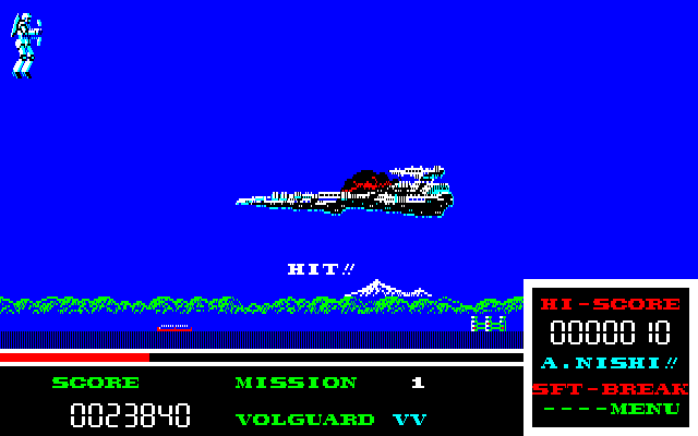 Volguard is a traditional shoot-’em-up. You fly a plane over a parallax-scrolling landscape, filled with enemy installations which you must bomb. An easy task, if it weren’t for the enemy attack waves. Most waves consist of planes flying in a straight line across the screen, without even shooting at you. Others bounce across the screen, and some are more dangerous, as they are flying in intricate patterns and firing multiple shot. Of course, you can fire back, but keep that at a minimum. The power bar at the bottom of the screen is depleted by your cannon, and when it has reached zero, your firing rate is very low. After a while, a route comrade will join you as a kind of power-up. When a third plane joins, you may merge your fighters into a flying robot.