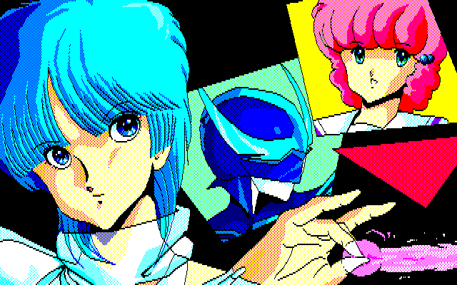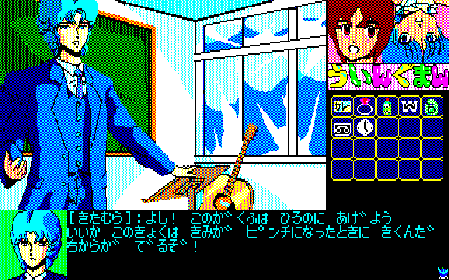 Wingman 2 is an Adventure game, developed and published by Enix Corporation, which was released in Japan in 1986 The aim of the game is to find the killers sent from Podrimus dimension and neutralize them. The clues are to be found in the eight locations of the school. Original story. This time it’s more fun since we’re accompanied by Aoi or Miki who do all the feedback. It’s a pretty cool system that it’s enough to write the proper verb and just click on the object – that’s almost point-and-click here! There are three chapters with first two moving between the same eight places and the third final one without any moving. In the prequel the fights were happening on a narrow black line with two small characters – this time there is a full battle screen and animation is much better. The scene of transformation to wingman was especially impressive since it has “Ching!” real voice cry coming out and there have not been voiced games yet. There seems to be only two battles in the game though compared to four in the original. So with only 8 locations and two battles the game is really short and a perfect run can be done in 10 minutes if you know the exploration part already.